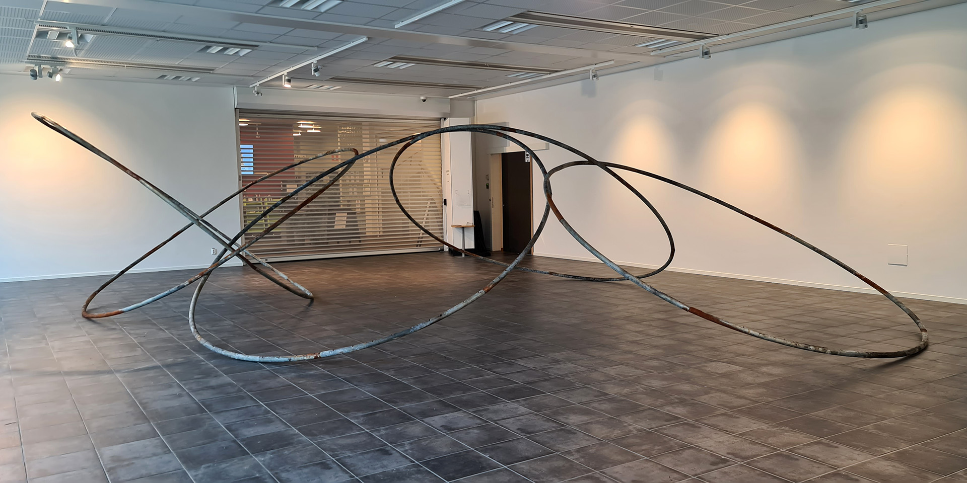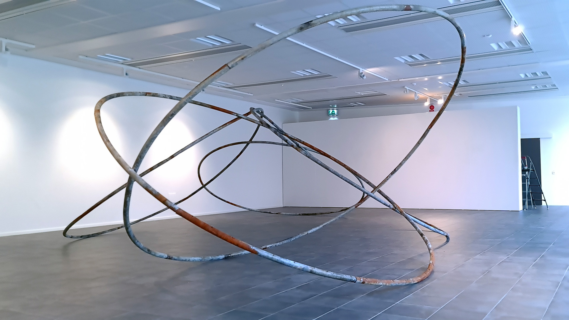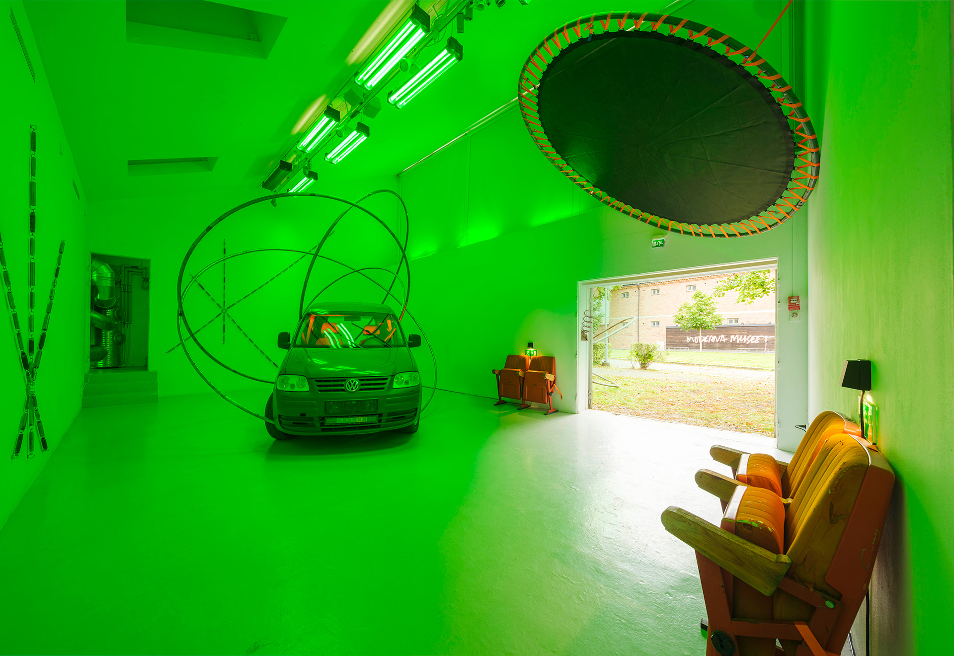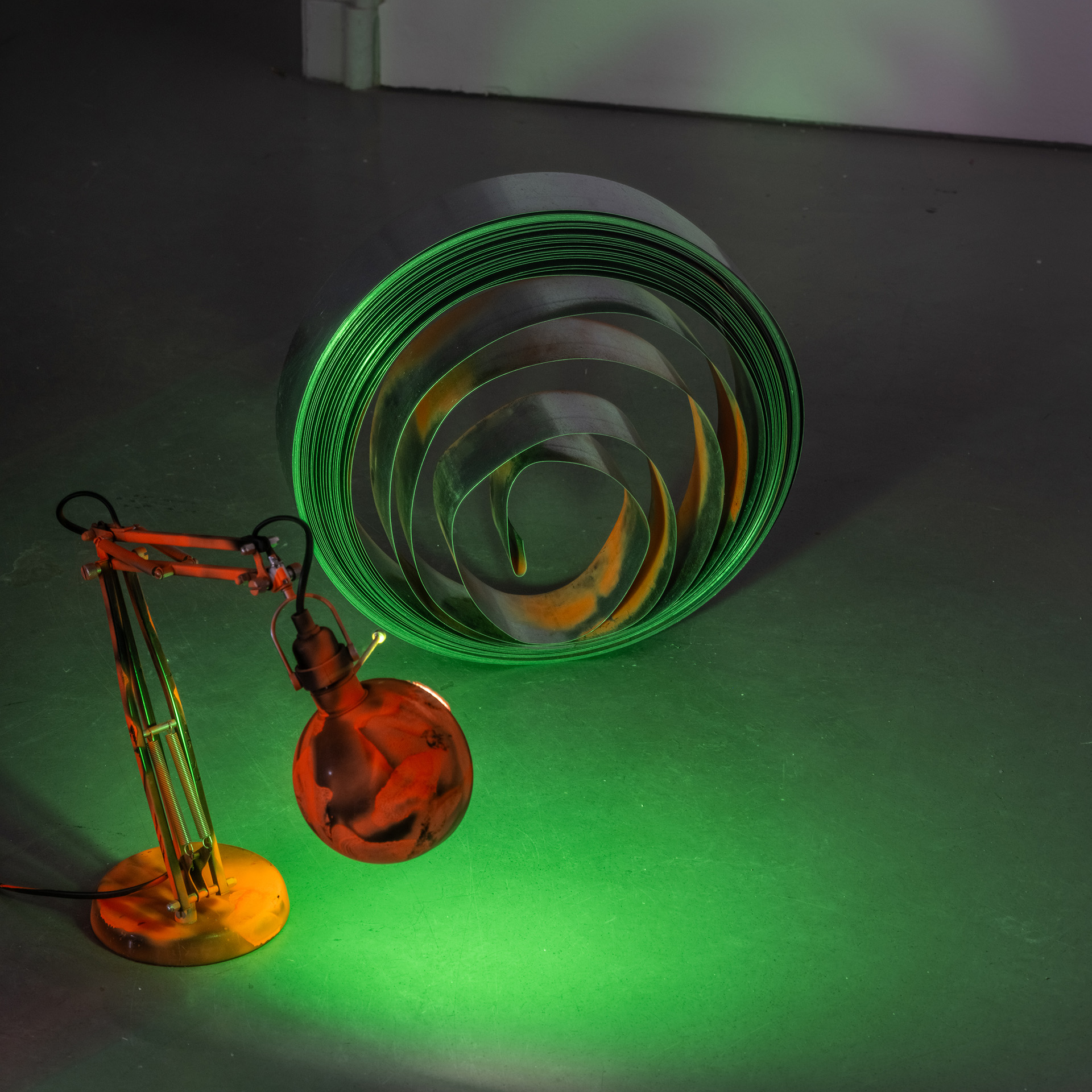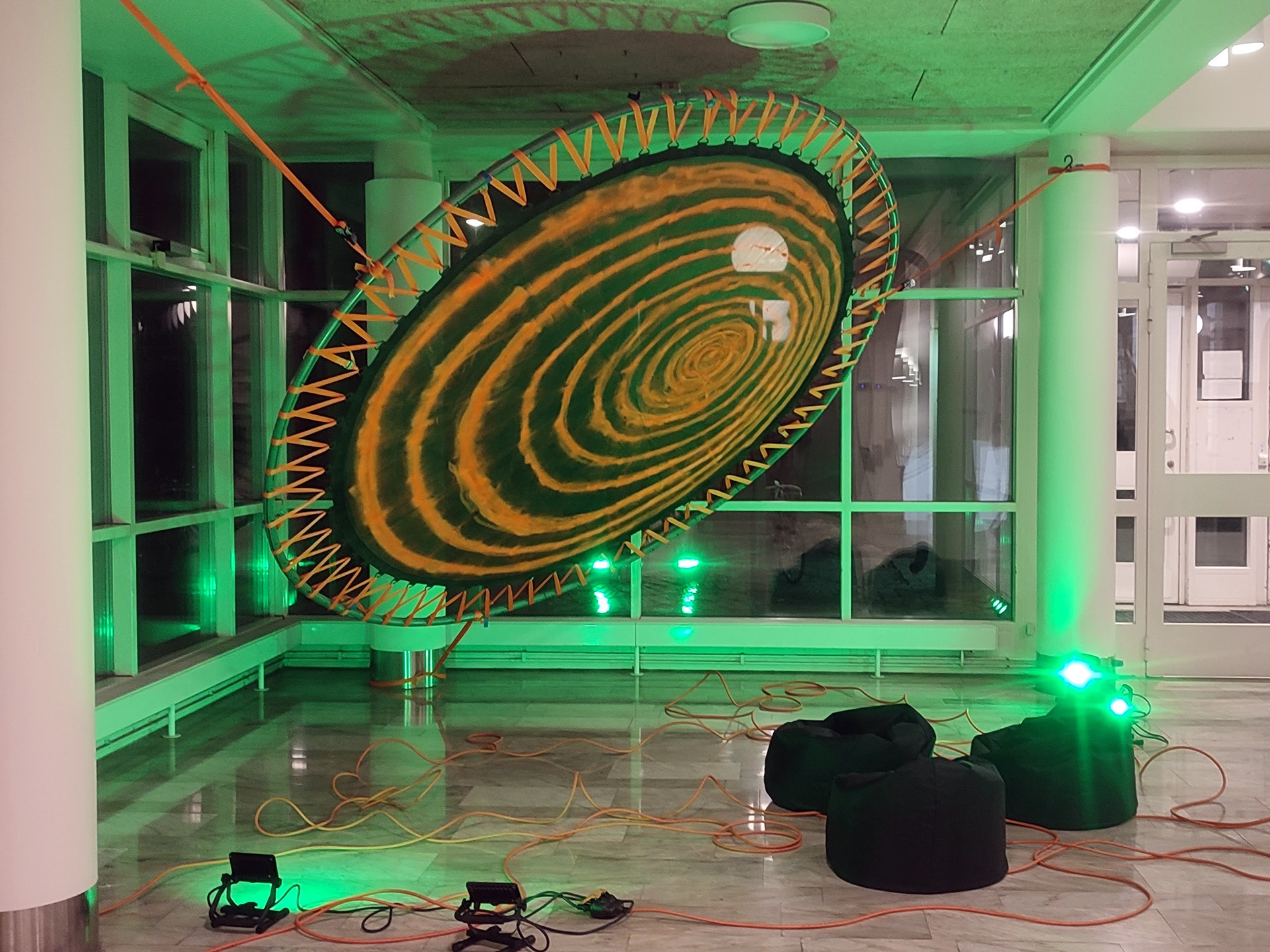Year: 2024. Materials: Old trampoline parts, straps, fluorescent spray paint.