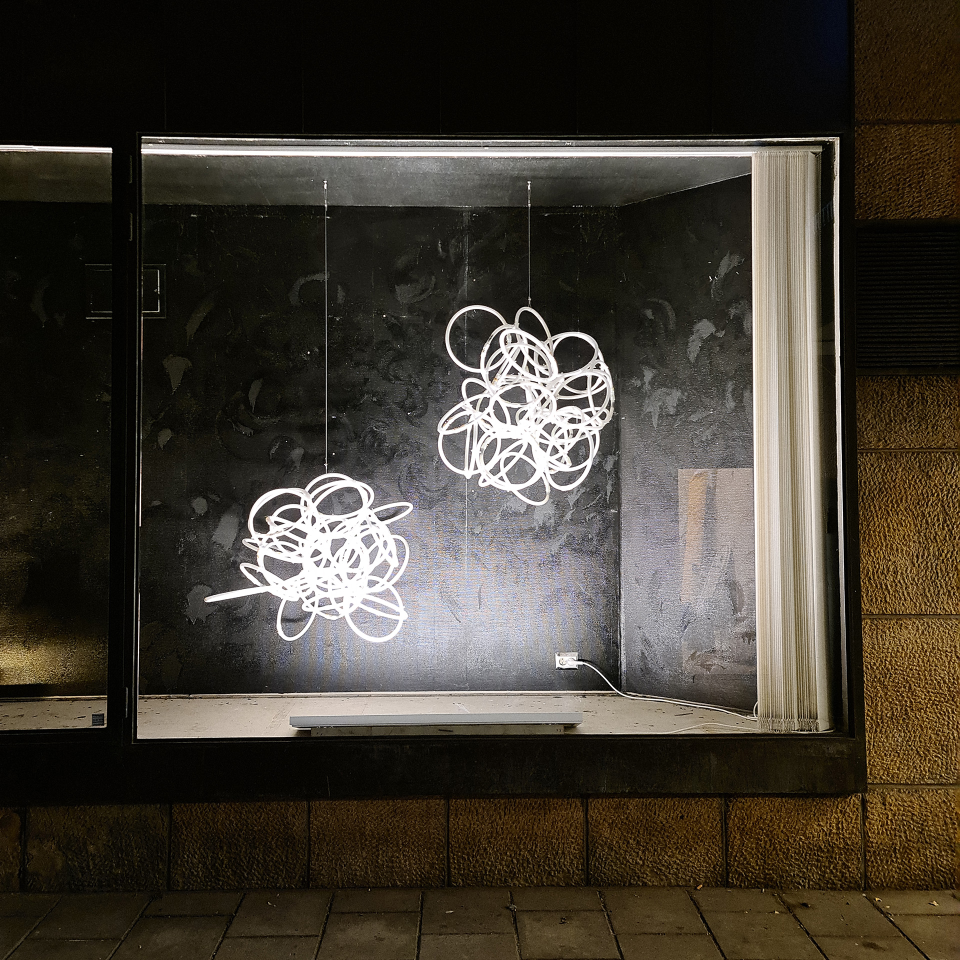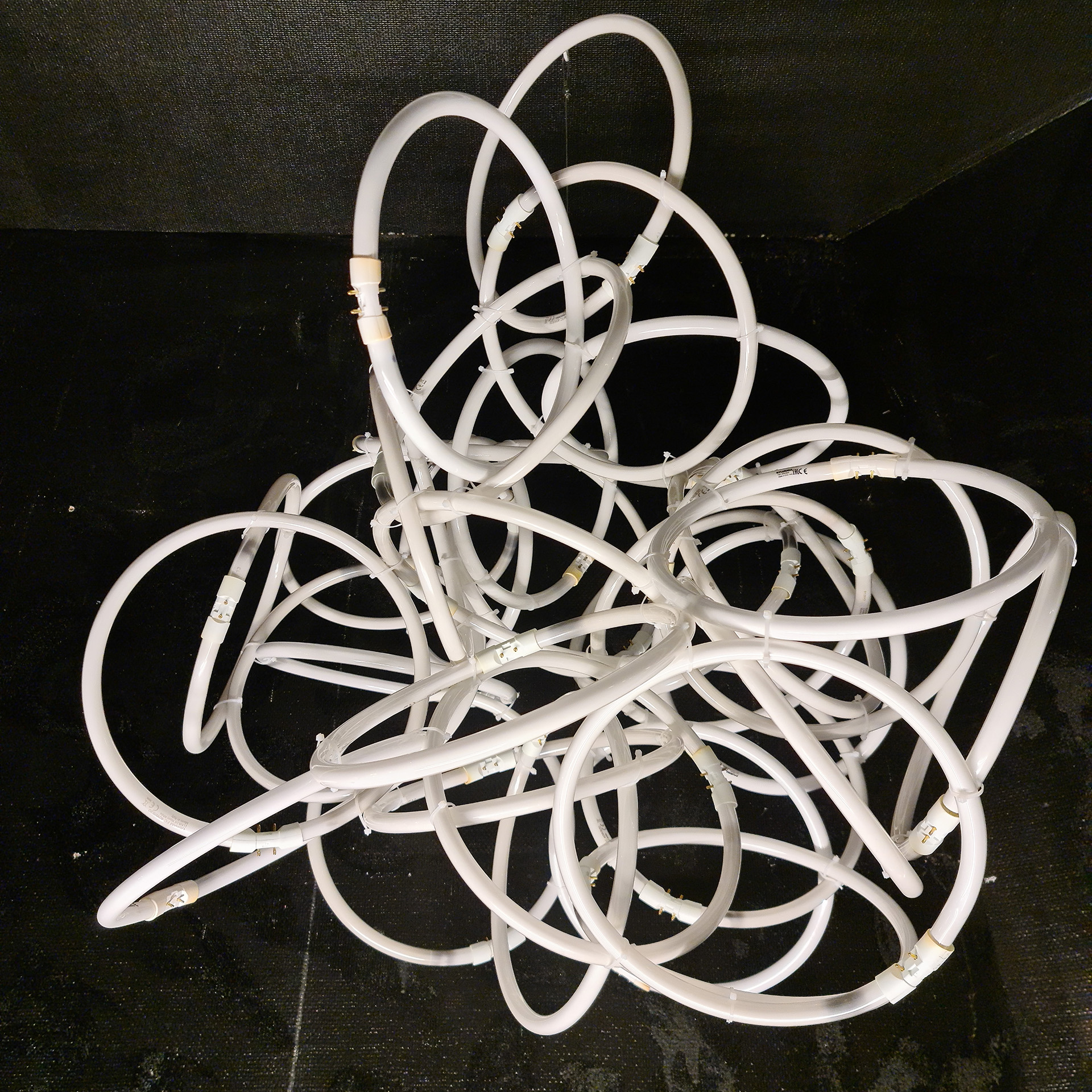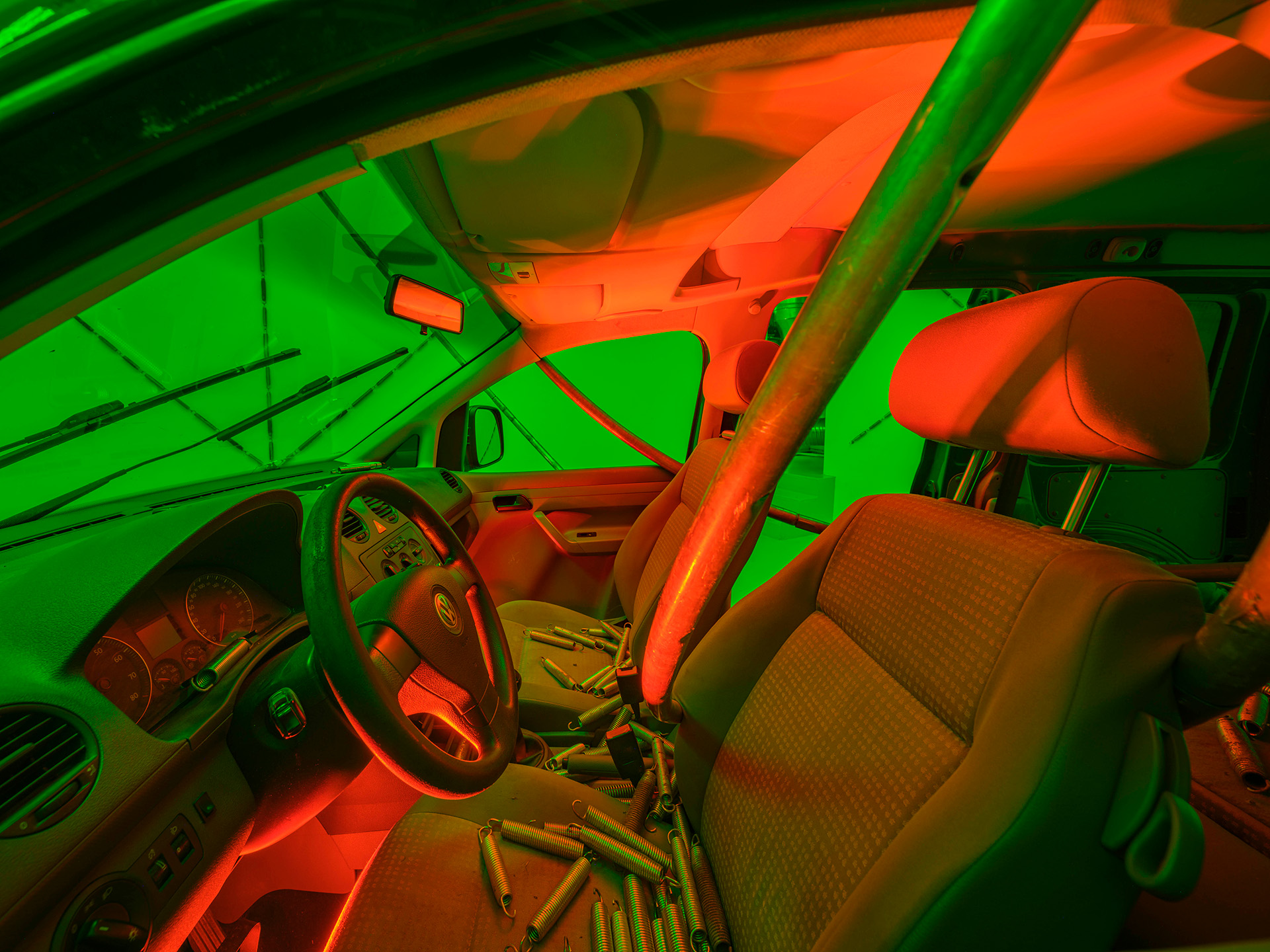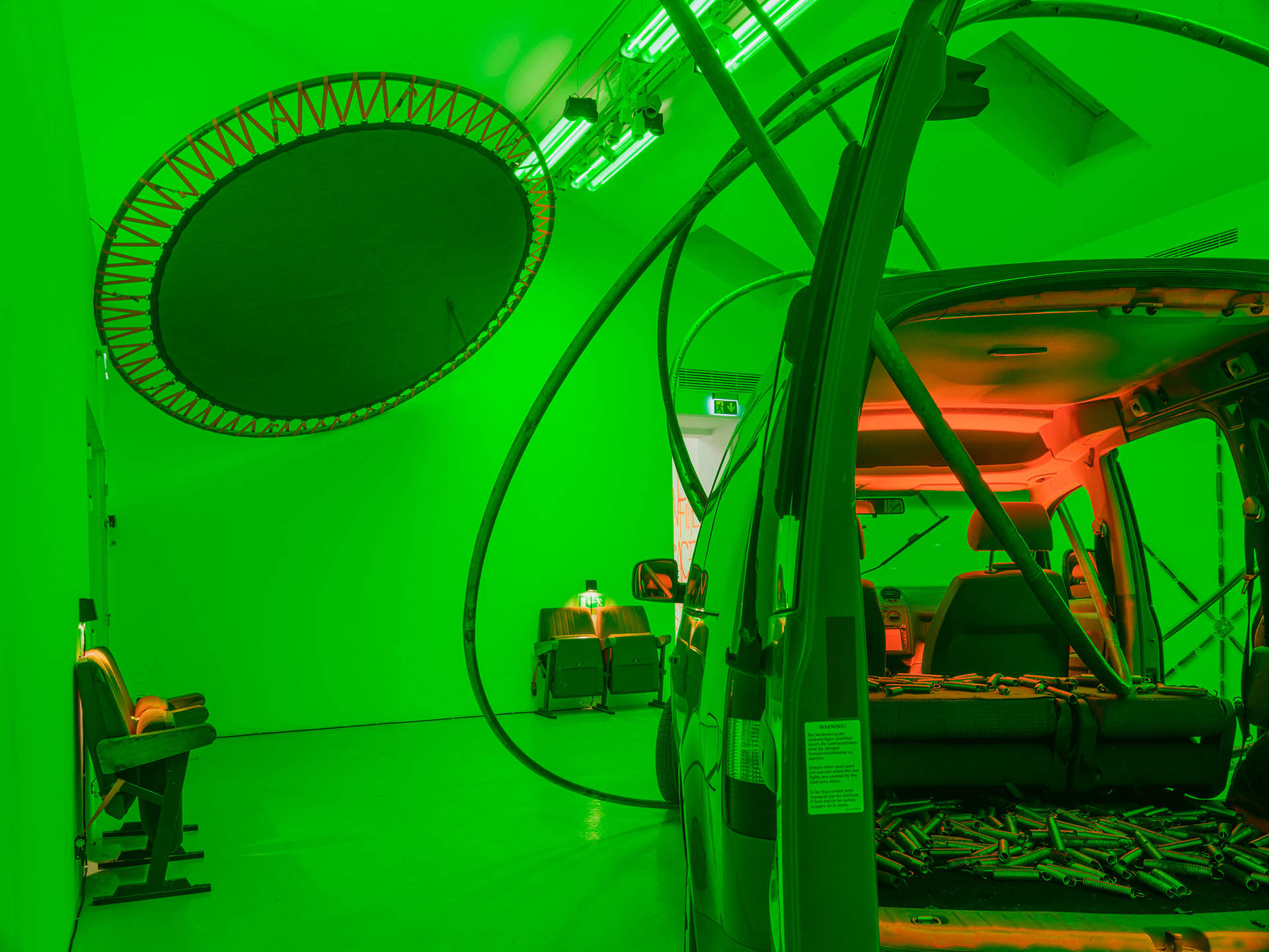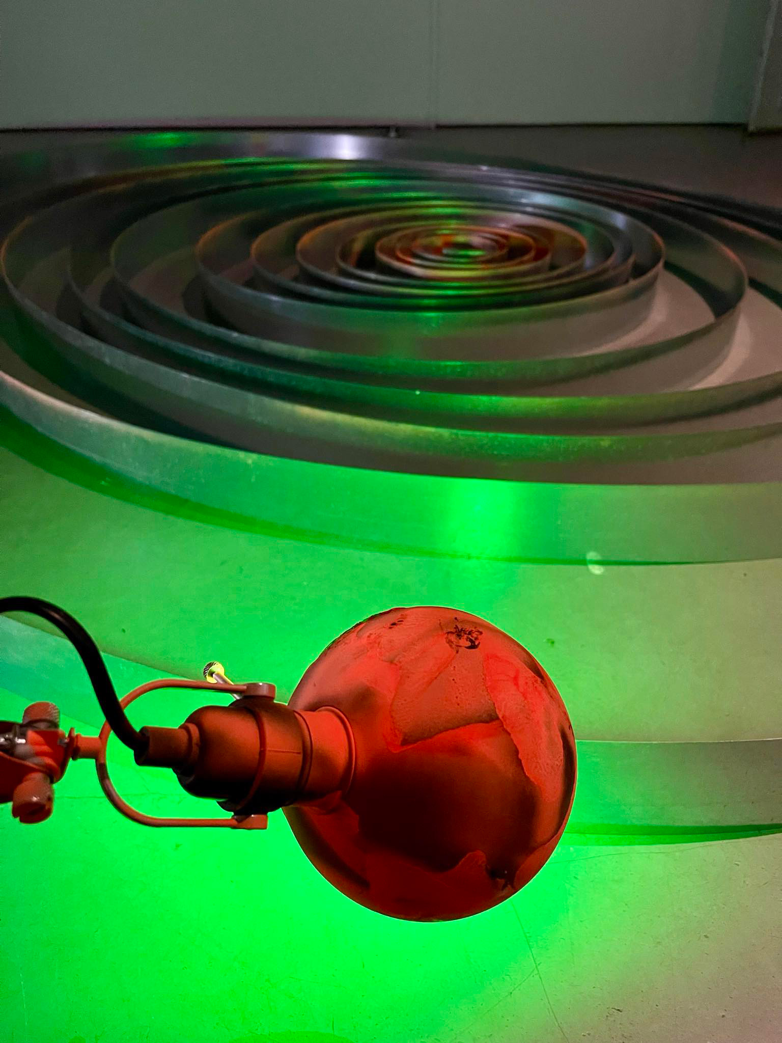 Year: 2024. Materials: Old trampoline parts, straps, fluorescent spray paint.